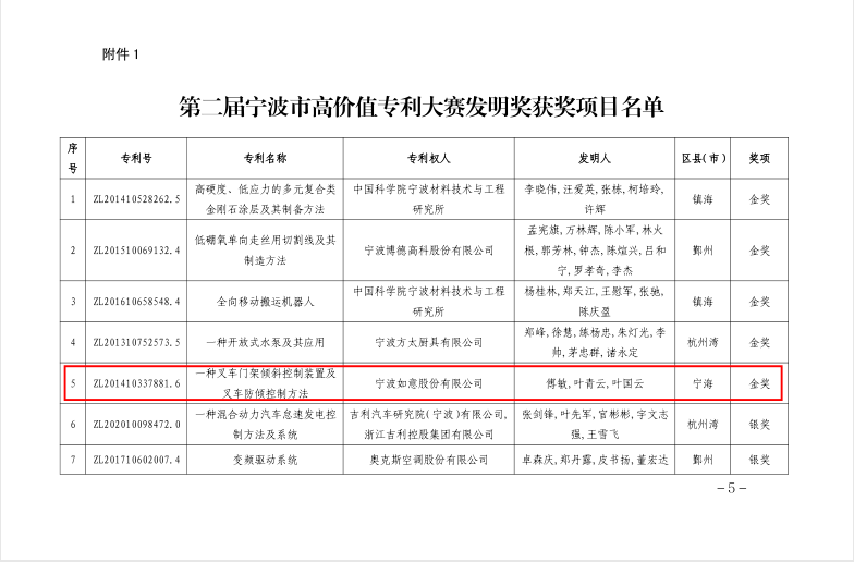 寧波如意發明專利項目:《一種叉車門架傾斜控制裝置及叉車防傾控制方法》在寧波市高價值發明專利大賽中榮獲“高價值發明專利金獎”,寧波市共五個金獎項目,寧海縣唯一一個金獎項目。發明人:傅敏,葉青云,葉國云。