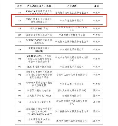日前,浙江省經信廳公布2021年度“浙江制造精品”名單,全省共295件產品入選,寧波市共38件,寧海縣2件。寧波如意CSDQ 型 1.6t 自主導航全向移動智能叉車成功入選。