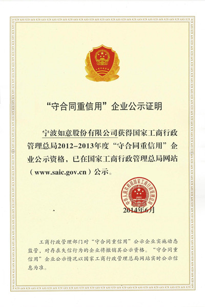 近日,如意公司獲得了國家工商行政管理總局授予的“全國AAA級守合同重信用企業”稱號,這是公司繼2003年以來第三次榮獲該稱號。