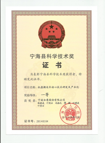 近日,寧海縣科技局組織專家按照《寧海縣科學技術獎勵辦法》的規定對全縣工業企業申報的科技獎項目進行了評審,最終我公司的“托盤搬運車核心技術研發及產業化項目”被評為2014年度寧海縣科技進步獎一等獎,全縣共有5家單位獲此榮譽。