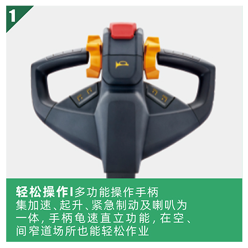 集加速、起升、緊急制動及喇叭為一體,手柄龜速直立功能,在空、間窄道場所也能輕松作業(yè)