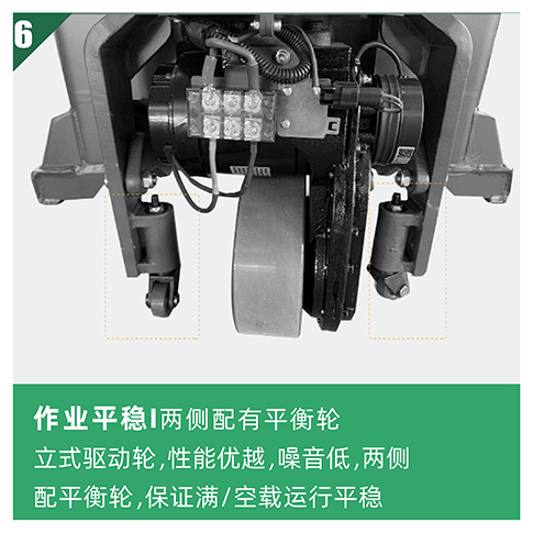 立式驅動輪,性能優(yōu)越,噪音低,兩側配平衡輪,保證滿/空載運行平穩(wěn)